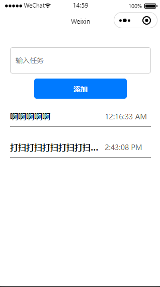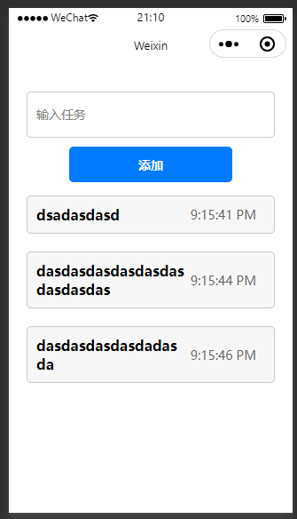 1 2 3 4 5 6 7 8 9 10 11 12 13 14 15 16 17 18 19 20 21 22 23 24 25 26 27 28 29 30 31 32 Page ({ data : { inputValue : '' , taskList : [] }, inputChange : function (e ) { this .setData ({ inputValue : e.detail .value }); }, addTask : function ( ) { var task = { task : this .data .inputValue , time : this .getRemindTime () }; var newList = this .data .taskList .concat (task); this .setData ({ taskList : newList, inputValue : '' }); }, getRemindTime : function ( ) { var currentTime = new Date (); var remindTime = new Date (currentTime.getTime () + 5 * 60 * 1000 ); return remindTime.toLocaleTimeString ('en-US' ); } });