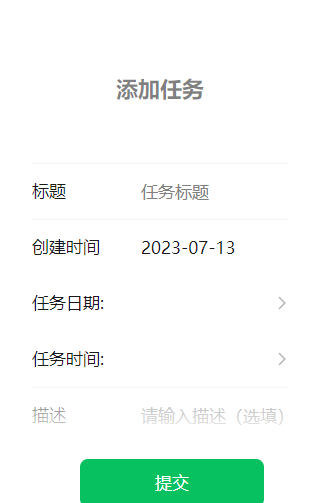 1 2 3 4 5 6 7 8 9 10 <form class ="weui-form" bindsubmit ="formSubmit" style ="padding-top: 0px;" > <picker mode ="date" value ="{{taskDay}}" bindchange ="bindTaskDay" start ="{{curDay}}" > <label for ="taskDay" class ="weui-cell weui-cell_active" > <view class ="weui-cell__hd" > <text class ="weui-label" > 任务日期</text > </view > <view class ="weui-cell__bd" > <text > {{taskDay}}</text > </view > </label > </picker >