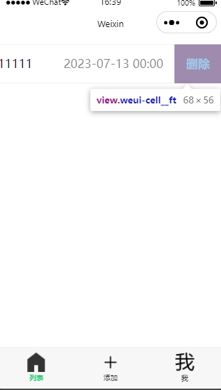 这里在外面套了一层 task-item-container ,并且加入了事件和 transform:translateX(-{{item.distance}}px); 以及新增一个删除按钮。